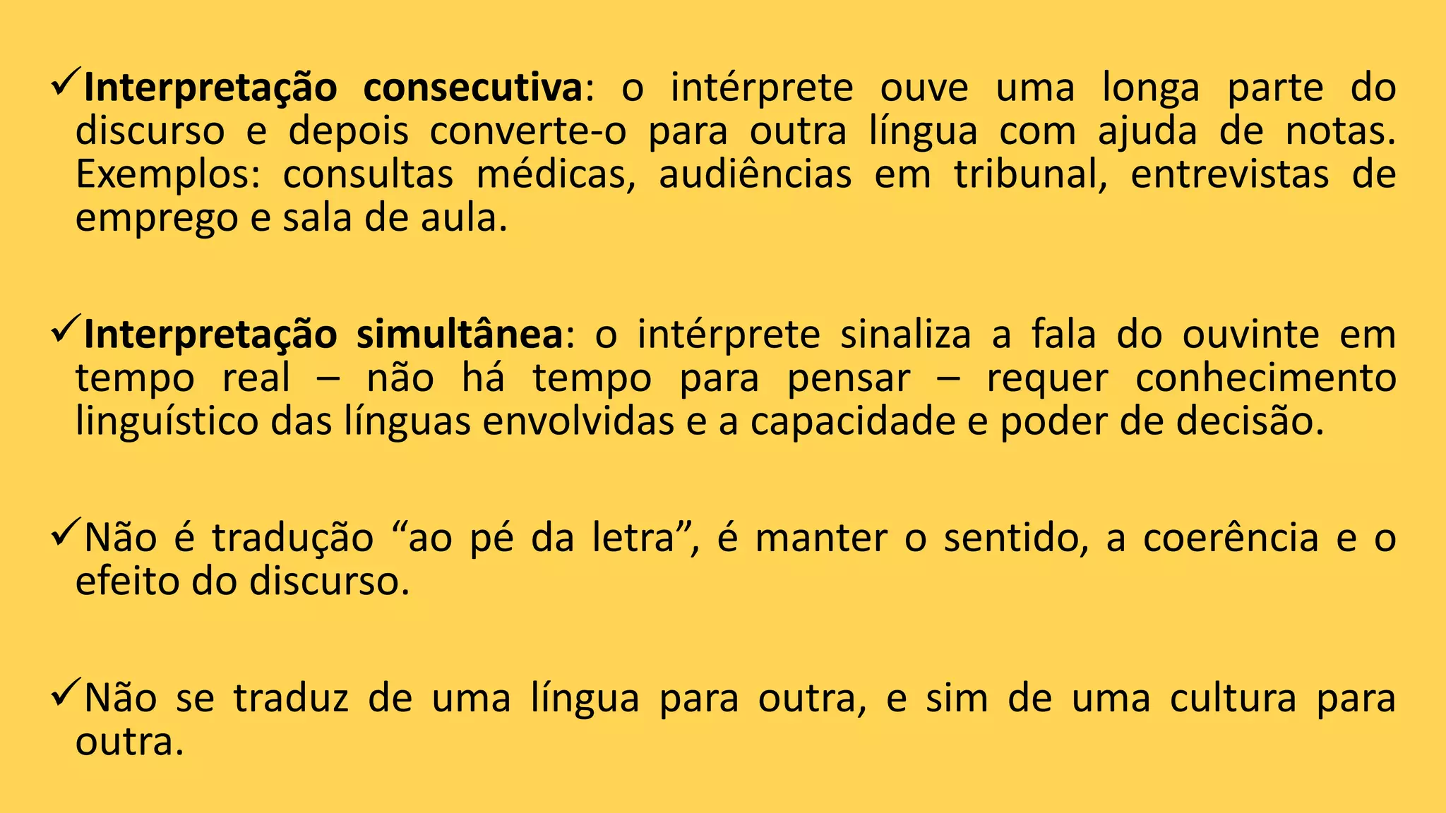 OcursodeTradutoreIntérpretedaLIBRASvisa formar profissionais para interpretarem oralmente e/ou naLIBRASdeforma simultânea ou consecutiva,deum idioma para outro, discursos, debates, textos, formasdecomunicação eletrônica, respeitando o respectivo contextoeas características culturais das partes.