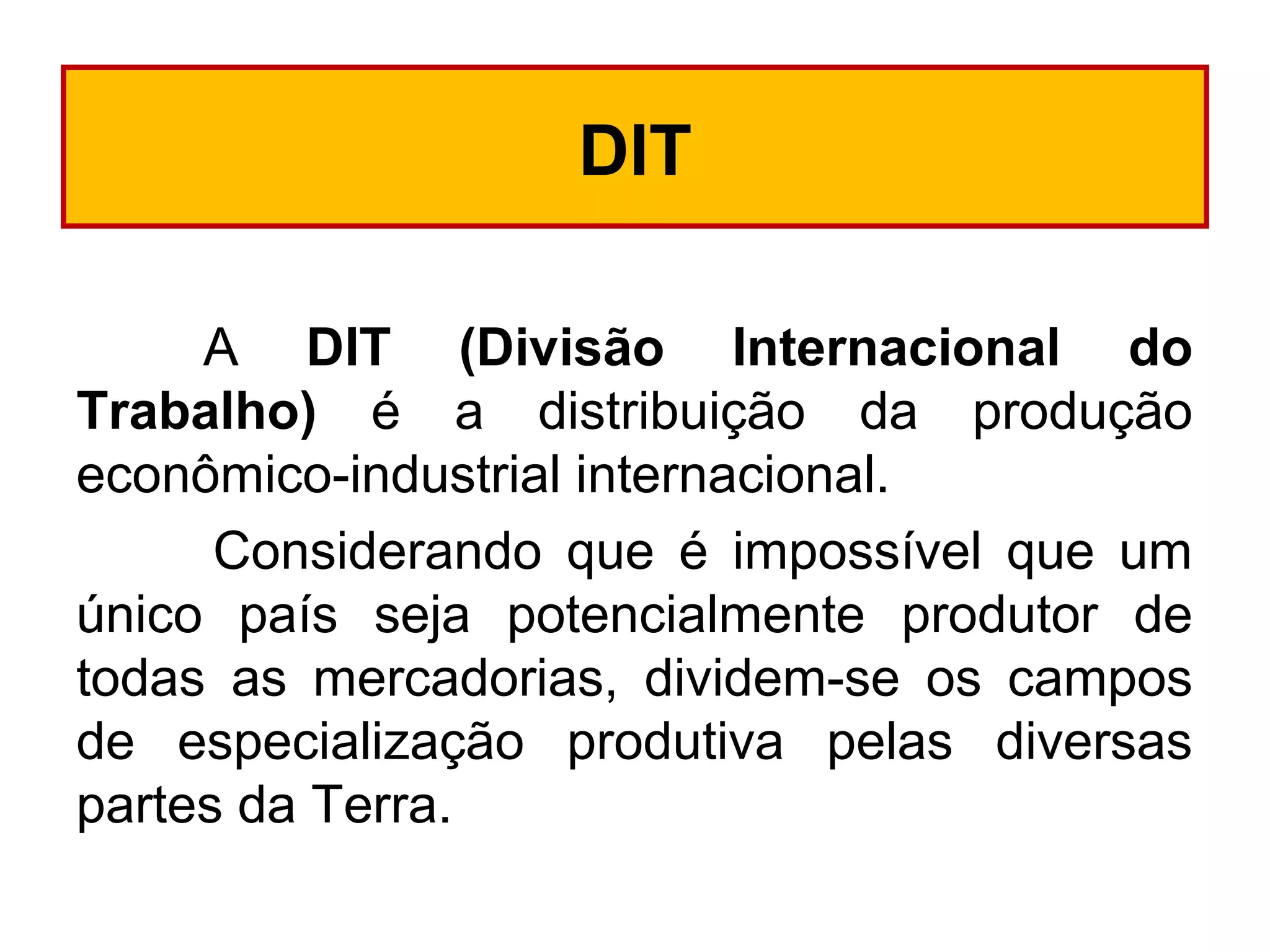 ADivisãoInternacionaldoTrabalho(DIT) éoconceito utilizado para descreveraforma pela qual se dãoosdiferentes processos de produçãonospaíses e áreas econômicas.