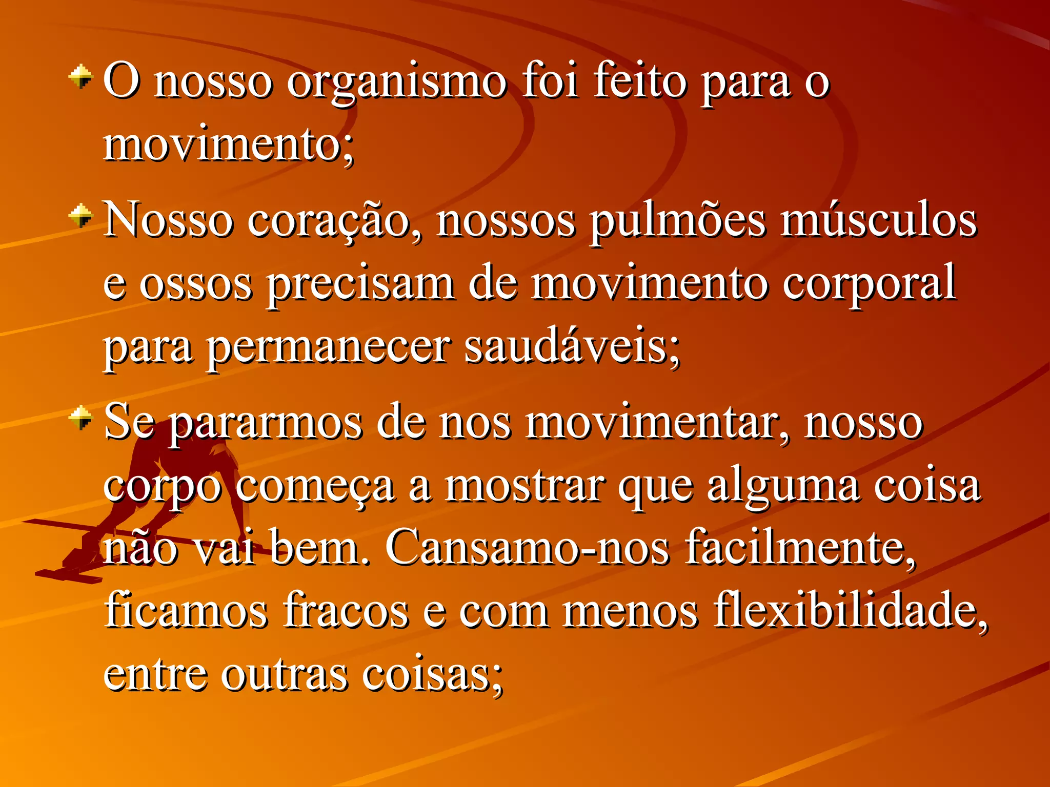 "Aimportânciadaatividadefísicaparaasaúdeestá diretamente relacionadaàmelhoriadaqualidade de vida, reduzindo consideravelmente os riscos de desenvolvimento de doenças cardiovasculares, diabetes, problemas relacionados a baixa imunidade, além dos transtornos de fundo emocional.